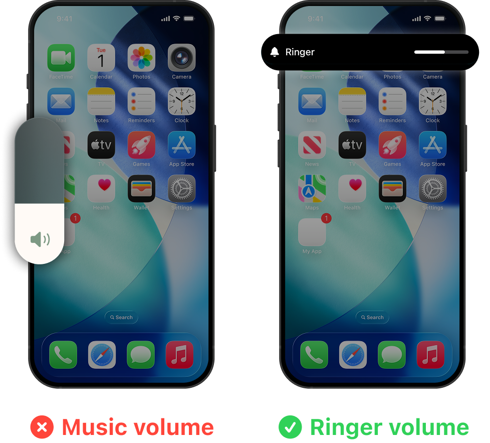 When using the side volume buttons, if you only see the music slider (left image), you’re changing music volume, not the alarm. Make sure the on-screen label says Ringer.
